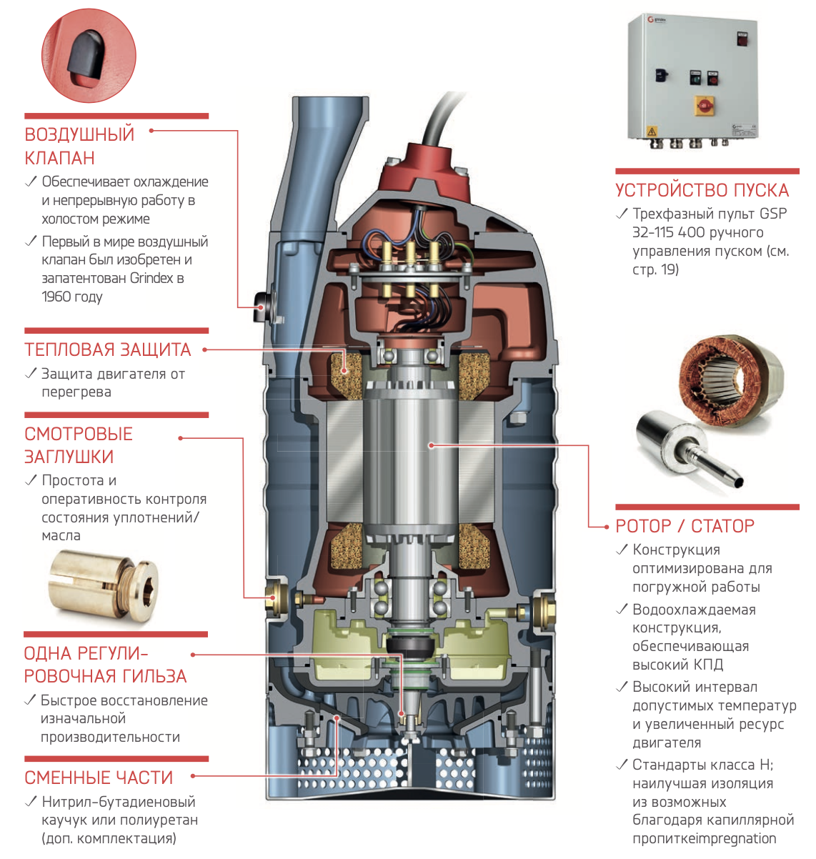Промышленные погружные дренажные насосы являются отдельным подвидом погружных дренажных насосов. Как видно из названия, они отличаются промышленным исполнением, то есть сконструированы таким образом, чтобы работать практически безостановочно. Особенностями дренажных насосов Grindex являются максимально инженерно возможная надежность, способность работать с сильно загрязненными жидкостями, а также минимальная удельная себестоимость перекачанного куба воды. Дренажные насосы Grindex расчитаны на перекачку загрязненных жидкостей с содержанием твердых аюразивных частиц до 10% по массе. Помимо этого насосы Grindex имеют свои уникальные технические решения, которые позволяют еще больше поднять их эффективность, а именно: